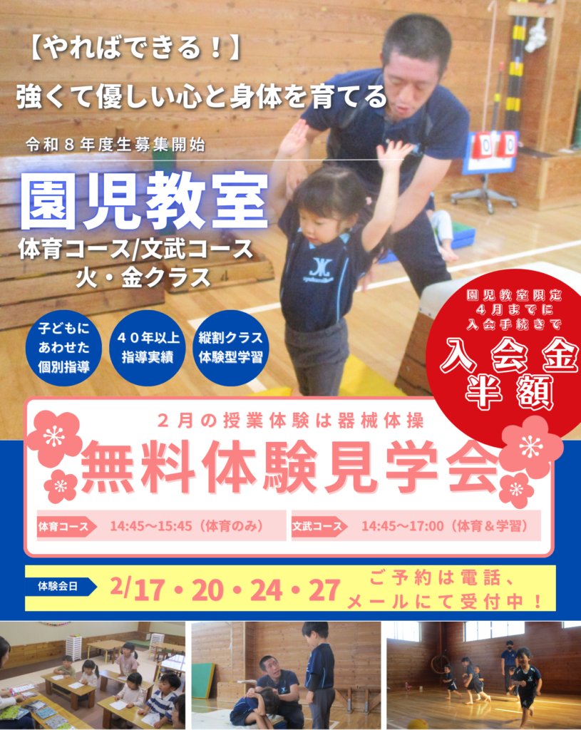 HOME 2026.01.28 ☆R8/2/11更新☆全ページ令和8年度用に更新☆次回親子ひろばは2/28です☆令和8年度の募集要領はこちら☆淑水館Instagramにて活動の様子を公開中です 令和8年度4月からの新規館生募集中! ⇩各教室の紹介はこちらから!⇩ 幼児教室 園児教室 小学生教室 中学生教室 剣道教室 書道教室 野球教室 個別教室 施設紹介 指導理念 保護者の皆様から