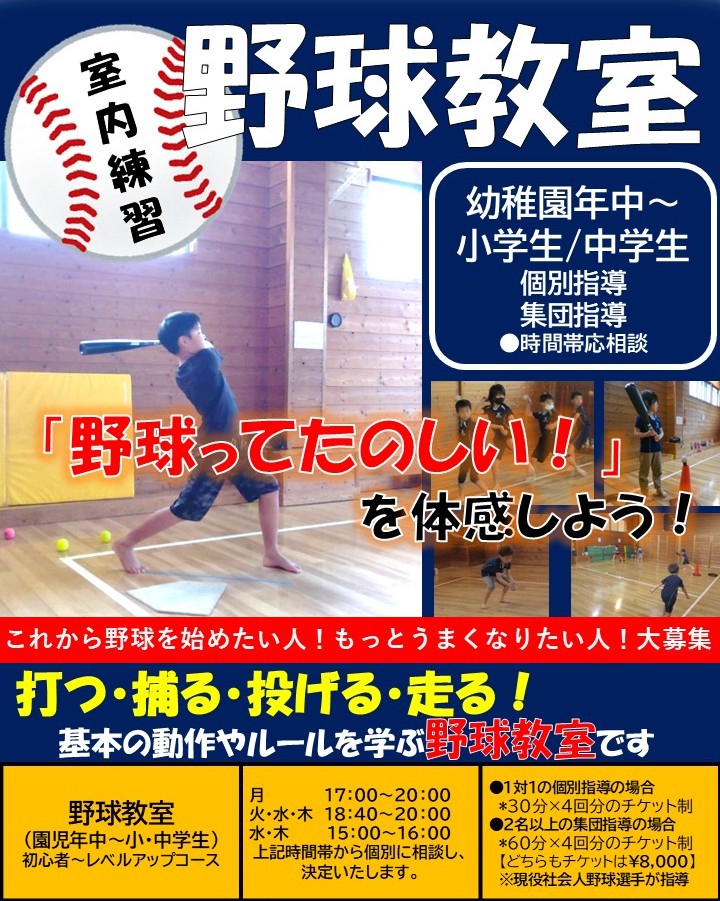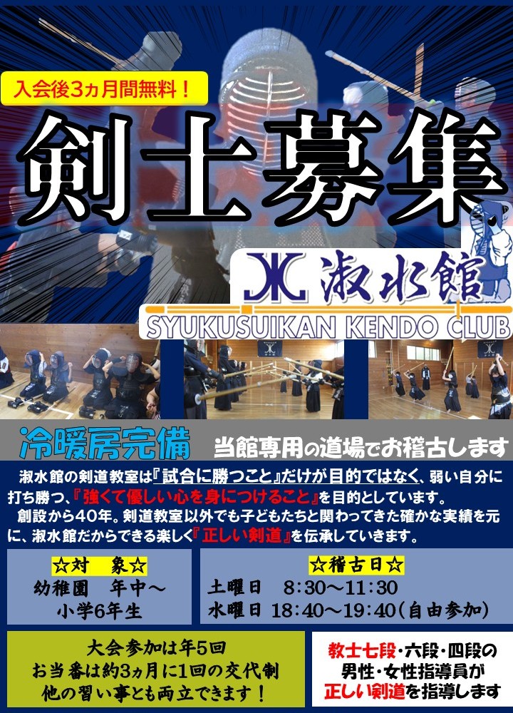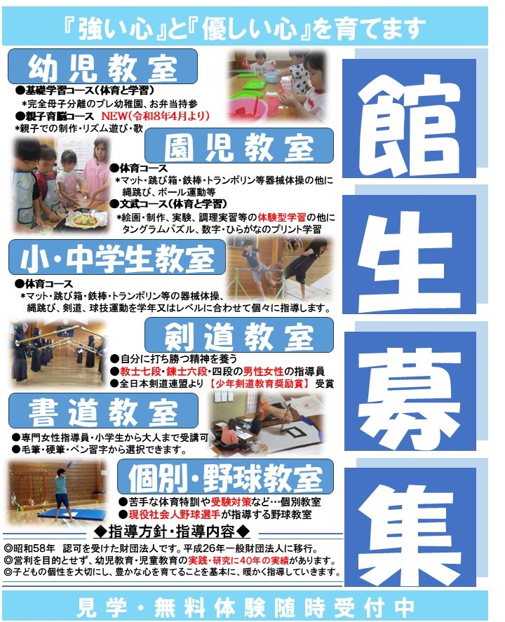 ☆おしらせ☆ 最終更新日 1/13 ☆令和8年度募集要領掲載開始☆ ※入会受付は1/28より 各ページ令和8年度開講予定クラス掲載中 【入会案内】令和8年度掲載中 【剣道教室】秋季大会入賞しました! 【野球教室】新規開講! ※1月の親子ひろばは28日です※