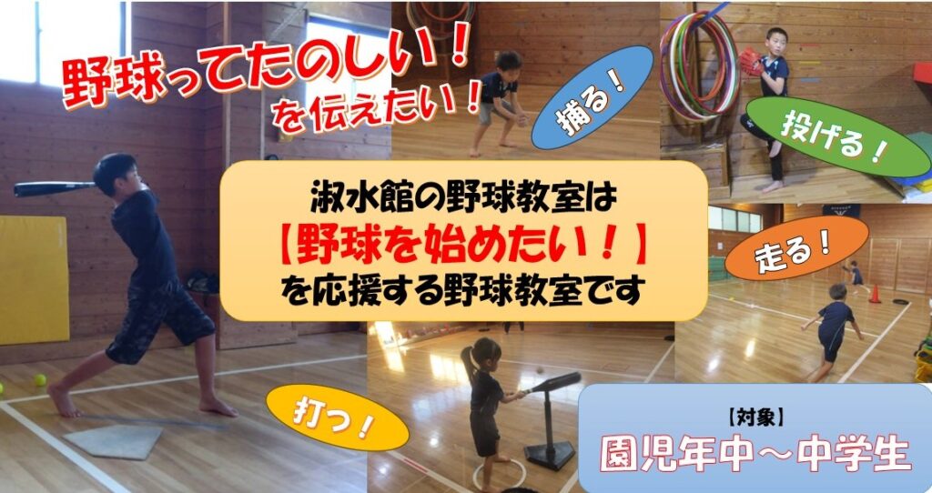 淑水館の野球教室はこれから野球を始めたい初心者の人から、チームでさらに活躍を目指す子どもたちのための教室です。