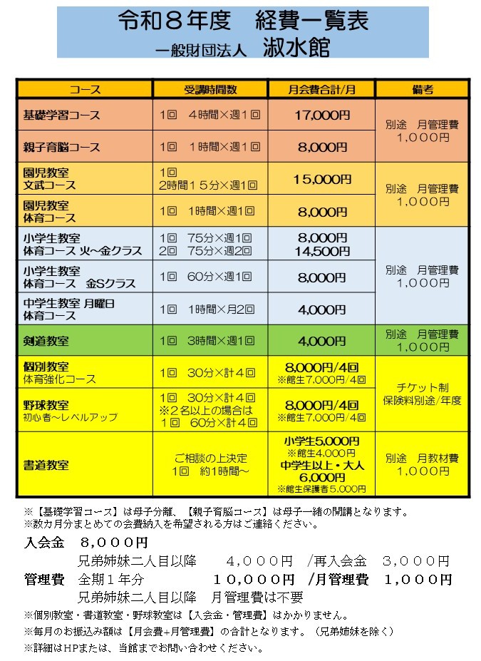| 3.月会費 | 幼児・園児文武/体育・小学生教室は 教材費を含む | 月会費一覧参照 |